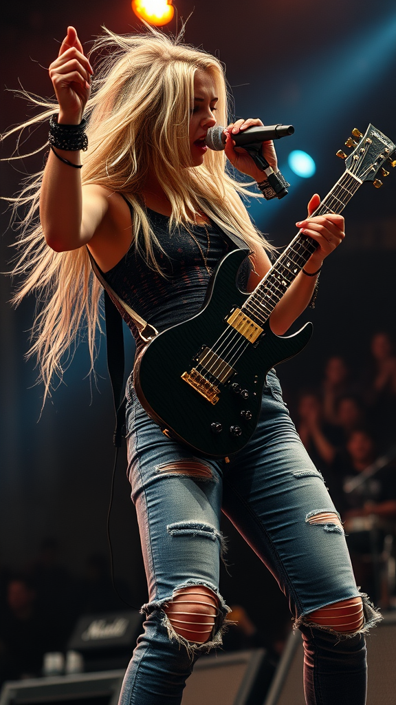 Norwegian female rockstar energetically performing on stage, her long blonde hair styled in a tousled, rock-inspired look. She's wearing edgy ripped jeans and accessorized with iconic rock elements. The image captures her in full body with cinematic lighting that enhances the atmosphere, combined with diffused soft lighting and a touch of artistic cinematic noise for depth. Her skin appears realistic and highly detailed, presented with a shallow depth of field and sharp focus. The photograph displays real shadows, offering a hyperrealistic quality in stunning 8k resolution. The scene is composed without imperfections, showcasing a dynamic and authentic performance.