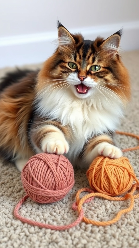 A charming Norwegian Forest Cat joyfully engages with a ball of yarn on a cozy carpet, ensuring the scene maintains clear focus and perfect anatomical accuracy. The cat's graceful movements and pristine setting emphasize its playful nature and endearing presence.