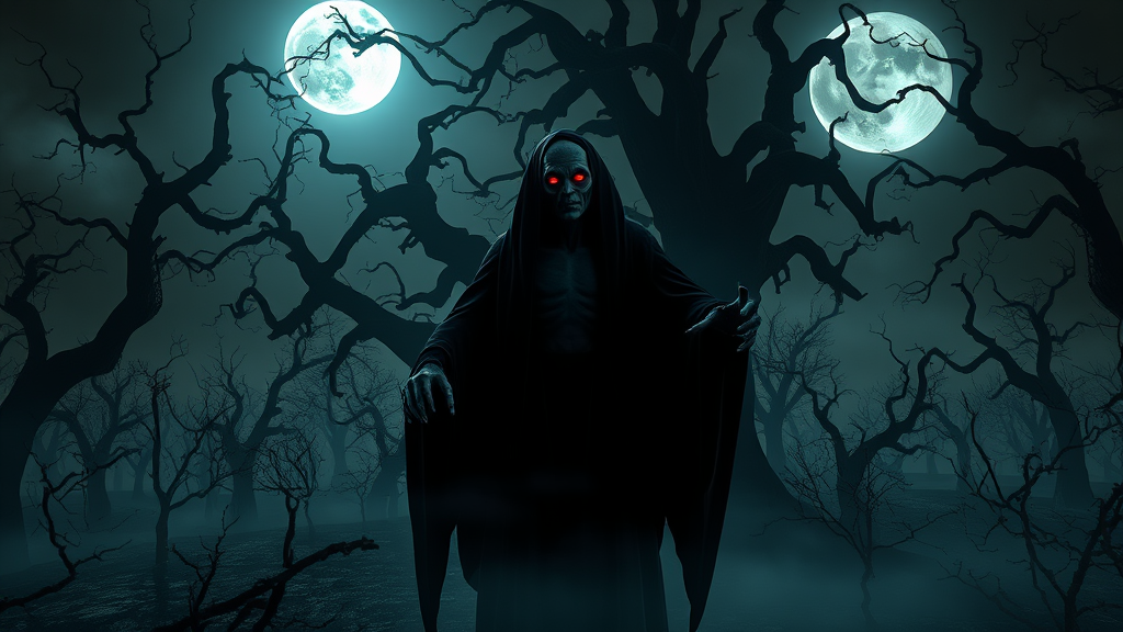 Nosferatu A Symphony of Horror, a captivating scene rendered in Daz3D, presents an eerie landscape bathed in haunting moonlight where shadows dance sinisterly. The ancient vampire, Nosferatu, stands at the heart of the composition, his gaunt figure silhouetted against a backdrop of twisted, gnarled trees. His piercing eyes glow with a supernatural intensity, and his elongated fingers are poised as though ready to weave nightmarish tales. The atmosphere is thick with an unsettling blend of dread and beauty, as mist curls around the barren earth and distant howls echo through the night. This chilling tableau is a testament to the power of horror and art, conjuring a world where the boundaries between dreams and nightmares blur.