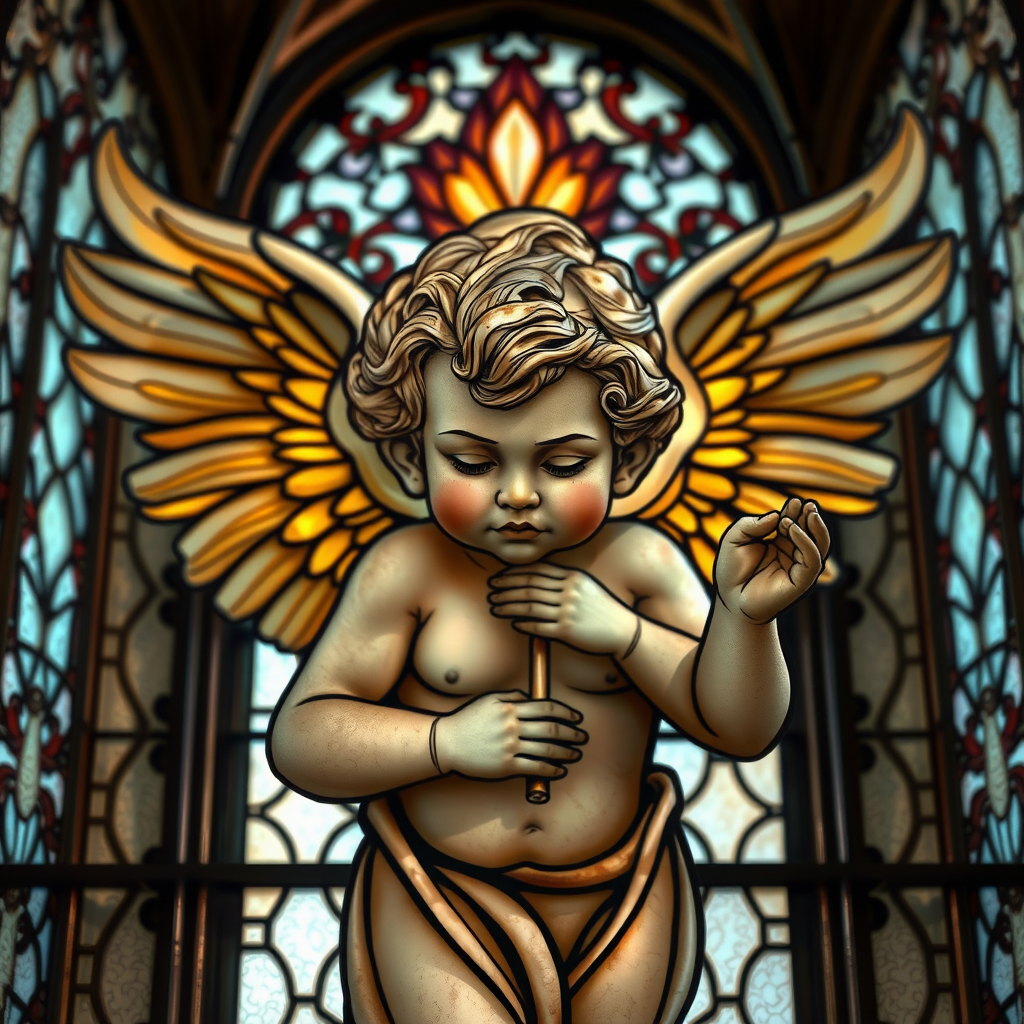 Nouveau Cherub Stained Glass Cathedral, hyperdetailed, backlit, 8k, UHD, HDR, Model: 526 Mix, with artistic imperfections such as duplicated features, unique distortions, creatively altered forms, intriguing symmetry, whimsical expressions, elongated elements, extra details, intricately designed hands, with a focus on abstract beauty, ensuring clarity and avoiding low resolution, framed within scope, maintaining visual purity without digital blemishes.