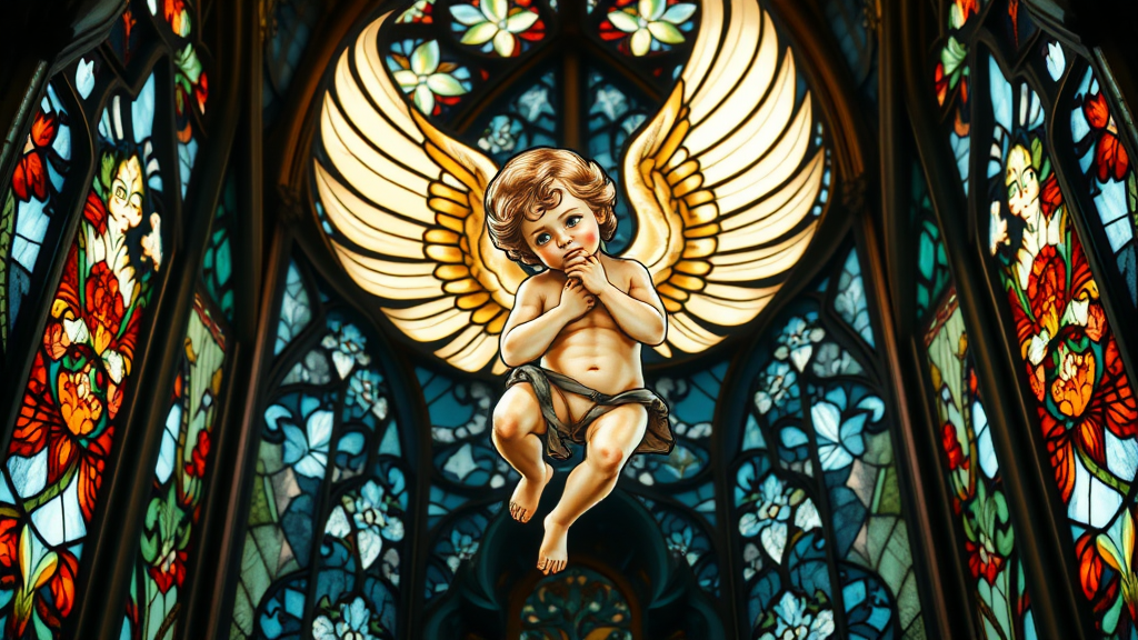 Nouveau Cherub Stained Glass Cathedral, hyperdetailed, backlit, 8k, UHD, HDR, artistic expression, visually intricate, ethereal glow, unique design, abstract elements, surreal features, elongated proportions, unexpected details, dreamy atmosphere, dynamic composition, harmonious colors, fluid shapes, captivating texture, mystical ambiance, enigmatic visuals, high resolution, pure artistry, immersive experience, seamless blend of form and light, creative interpretation, reimagined motifs, delicate details, refined aesthetic, vivid imagination, emblematic beauty, transcendent vision, ornate craftsmanship, inspired innovation, expressive contrasts, emotive storytelling.