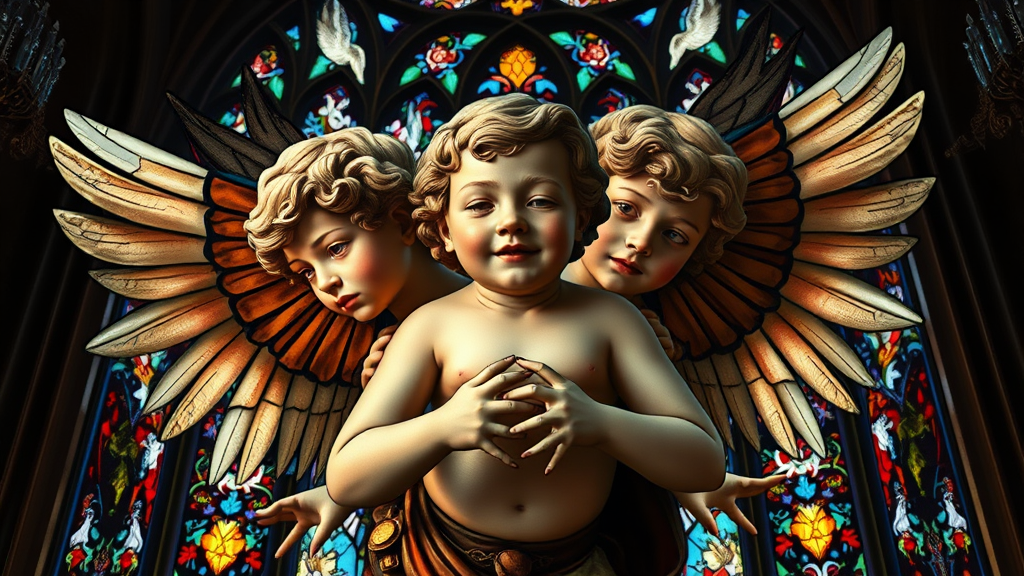 Nouveau Cherub Stained Glass Cathedral, hyperdetailed, backlit, 8k, UHD, HDR, Model 526 Mix, duplicated features, surreal, elongated forms, unique facial expressions, artistic interpretation, whimsical anatomy, extra limbs, abstract hands, dreamlike composition, intricate patterns, vivid colors, dynamic lighting, ethereal ambiance, softly blurred elements, minimized artifacts, clear focus, harmonious design, smooth gradients, cohesive narrative, artistic watermark integration, modern reinterpretation, seamless blend, imaginative storytelling.