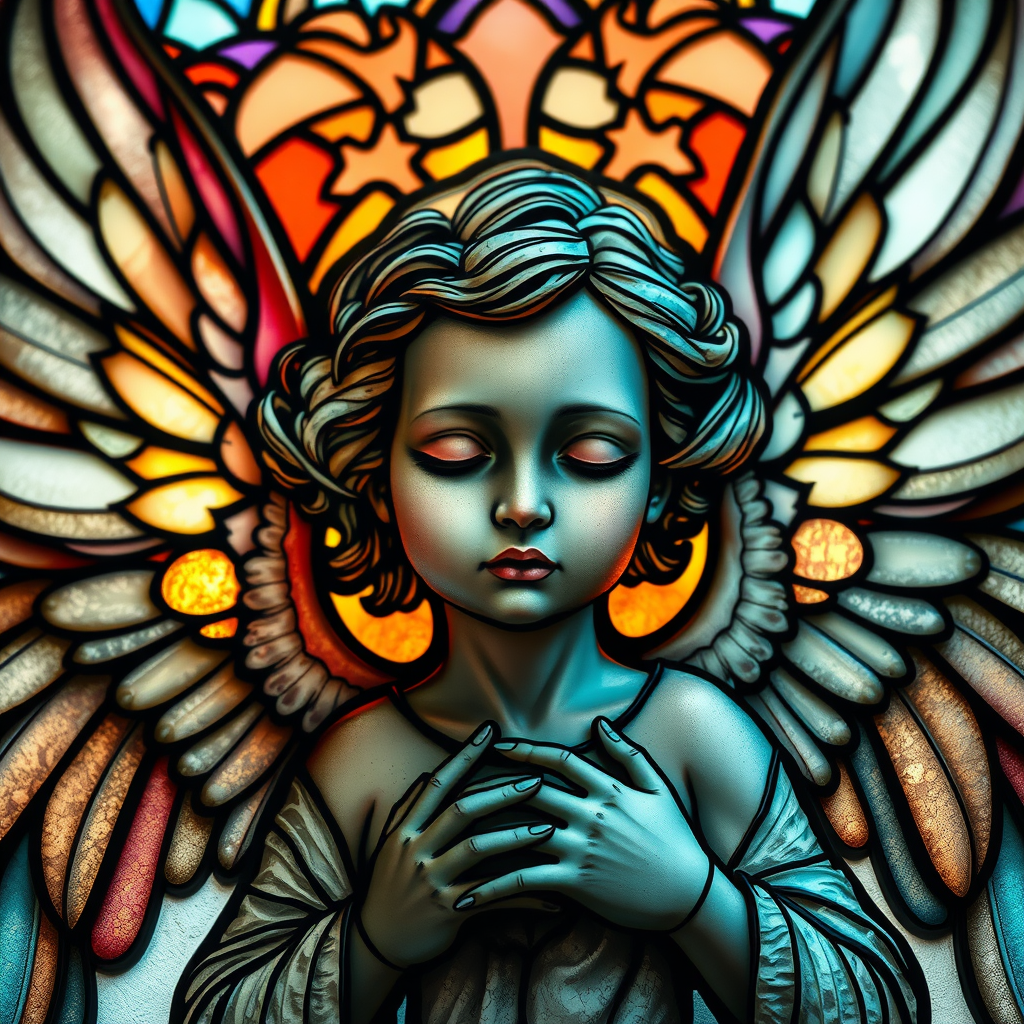 Nouveau Cherub Stained Glass Cathedral, hyperdetailed, backlit, 8k, UHD, HDR, intricate design, ethereal beauty, celestial harmony, Model: 526 Mix, artistic interpretation, unique facial features, elongated neck, abstract hands, merged forms, visionary art, whimsical details, dreamy expression, vibrant colors, soft focus, subtle gradients, clean, seamless, immersive composition, captivating narrative, artistic flair.