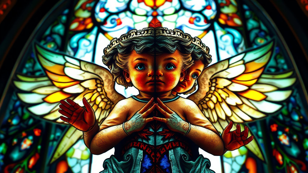 Nouveau Cherub Stained Glass Cathedral, hyperdetailed, backlit, 8k, UHD, HDR, Model: 526 Mix, duplicate, surreal, abstract, unique features, elongated neck, additional fingers, distorted hands, captivating expressions, symmetrical patterns, artistic flair, vibrant colors, dreamlike atmosphere, otherworldly setting, intricate details, dynamic composition, ethereal glow, imaginative design, seamless integration, subtle complexity.