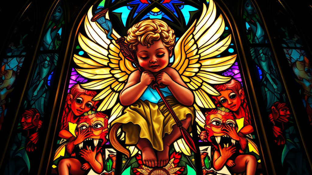Nouveau Cherub Stained Glass Cathedral, hyperdetailed, backlit, 8k, UHD, HDR, Model: 526 Mix, surreal, abstract, ethereal, exaggerated features, elongated forms, intricate patterns, vibrant colors, luminous, dreamlike, multifaceted, overlapping figures, whimsical expressions, harmonious chaos, otherworldly atmosphere, intricately detailed, seamless blend, painterly texture, softly blurred edges, otherworldly light diffusion, delicate imperfections, subtle surrealism, immersive visual experience.