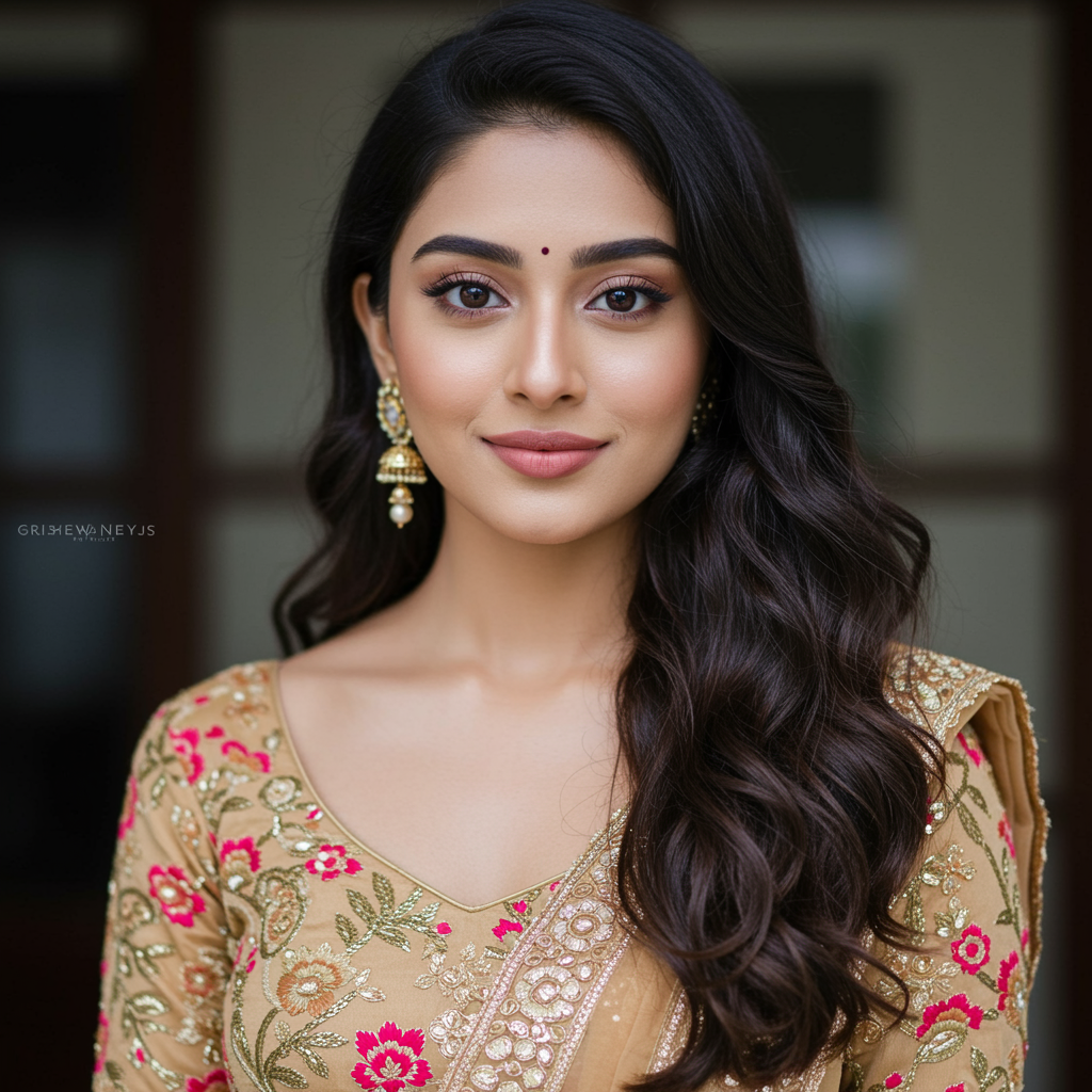 Nyla, a 22-year-old woman, radiates beauty and elegance with her luminous, fair complexion. Her captivating almond-shaped eyes, framed by dark, lush lashes and perfectly arched brows, draw you in. Her heart-shaped face features a petite, upturned nose and full, inviting lips that form a charming smile. Luxurious dark brown waves flow gracefully down her back, enhancing her flawless appearance. Whether in traditional Indian attire or stylish Western outfits, Nyla exudes confidence and sophistication. Her intelligence, charisma, and compassionate nature shine through, making her a symbol of inspiration and empowerment in the digital world.