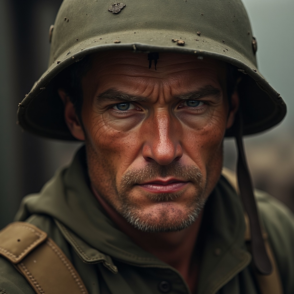 A captivating oblique view portrait of a seasoned World War II U.S. marine, the soldier's rugged face tells stories of bravery and resilience. The helmet rests firmly atop his head, its surface weathered by time and the elements. Painted with exquisite detail, the marine's expression carries a subtle combination of resolve and nostalgia, capturing the echoes of distant battles. This stunning piece draws inspiration from the styles of Greg Rutkowski and Magali Villeneuve, with a rich interplay of light and shadow across the marine's features, highlighting his piercing gaze and the contours of his timeworn skin, while the background softly blurs, emphasizing the warrior's steadfast presence.