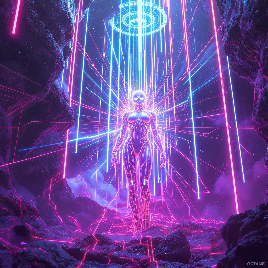 A photorealistic 8K octane render depicting a figure fully immersed in a cyberpunk world, surrounded by vibrant neon colors and intricate neural networks. The setting is rich with hues, with beams of epic light streaming around the character, reflecting the passion and energy of this futuristic landscape. The composition is elegant and hyper-detailed, with a distinct emphasis on bright, electrifying tones against a stark white background, creating an intense contrast. The overall atmosphere is dynamic, capturing the essence of advanced machine learning technologies in a visually stunning manner, with a full-body portrayal that emphasizes the fusion of human and machine, bathed in radiant lightrays.