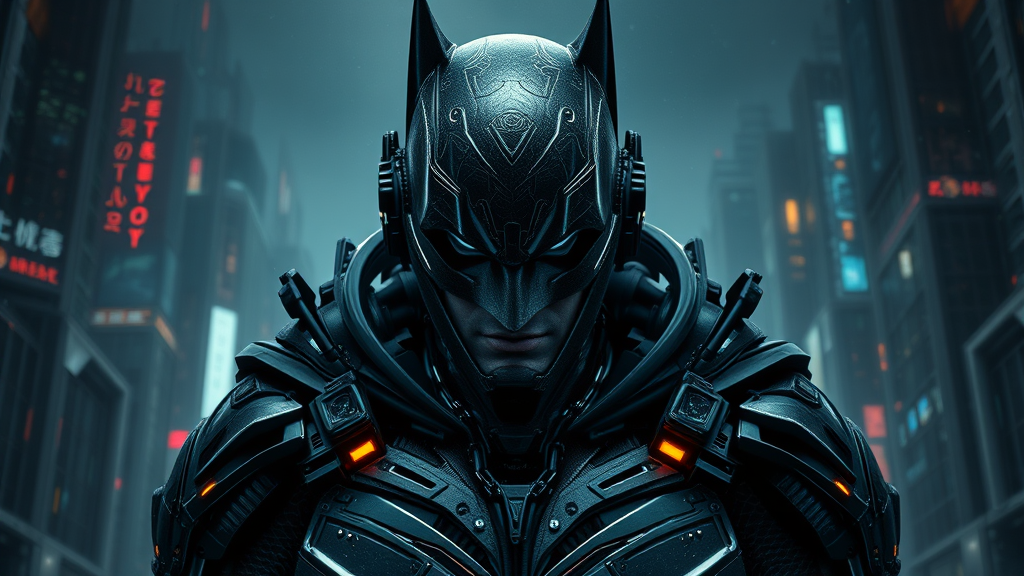 Octane render of a cyberpunk Batman inspired by Tsutomu Nihei, facing the camera with a highly detailed and ornate design. The background is dark and enigmatic, featuring digital elements and abstract urban landscapes. The scene presents a blend of CGI and artistic illustration, capturing a mysterious and futuristic atmosphere with a focus on vivid textures and intricate mechanical details, creating a visually striking and immersive representation of this iconic character.