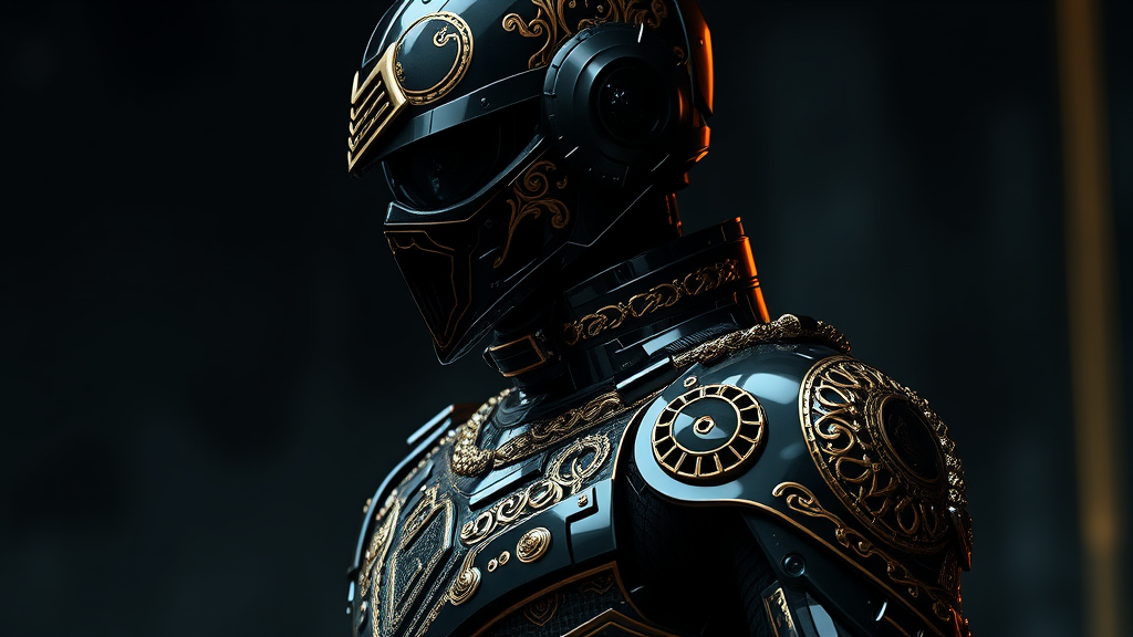 octane render of a cyberpunk-inspired vigilante, designed in the style of Tsutomu Nihei, featuring a chrome silk armor adorned with intricate, ornate weaved golden filigree. Set against a shadowy, enigmatic backdrop that enhances the mysterious allure, the scene captures the essence of futuristic guardian. The dark environment is subtly illuminated to highlight the intricate details without distracting from the overall aesthetic, evoking a sense of silent protection and advanced technology.
