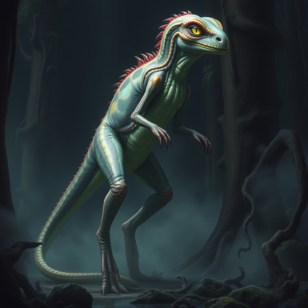 Oddly colored reptilian creature with elongated limbs and shimmering scales, set against a dark, primeval landscape. Tall and slender, it resembles a prehistoric dinosaur with alien features, such as luminescent eyes and bioluminescent patterns on its skin. Its presence exudes a raw, untamed energy as it navigates through the ethereal mists and towering, otherworldly foliage of its mysterious habitat.