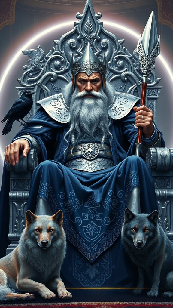 Odin, the Allfather of Norse mythology, sits regally on his towering silver throne in the great hall of Asgard. His penetrating, one-eyed gaze emanates both wisdom and an untamed power, and his long, shimmering beard flows like a cascade of stars. He is adorned in elaborate silver armor and a deep midnight-blue cloak embroidered with runic symbols that seem to move with a life of their own. In his grasp is the legendary spear Gungnir, its tip glinting with an otherworldly light. The throne itself is intricately carved with timeless patterns, glowing softly with the energy of the Nine Realms. Ravens Huginn and Muninn are perched attentively upon the armrests, while wolves Geri and Freki rest faithfully at his feet. The ethereal glow of the Bifrost arches behind him, filling the hall with luminous hues, as a palpable sense of divine authority and mystery fills the air.
