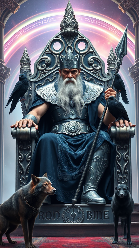 Odin, the Allfather of Norse mythology, sits regally on his towering silver throne within the grand hall of Asgard. His intense, one-eyed gaze emanates both wisdom and authority, while his flowing silver beard glimmers like moonlight. Clad in ornate silver armor and a deep indigo cloak adorned with intricate runic designs, he wields the legendary spear Gungnir. The throne itself is intricately carved with ageless patterns that pulse softly with the mystic energy of the Nine Realms. Ravens Huginn and Muninn rest on the armrests, eyes sharp and watchful, while wolves Geri and Freki stand vigilant at his feet. The ethereal glow of the Bifrost arches in the background, spilling radiant colors across the hall, as an aura of divine command and enigmatic mystery fills the expanse.