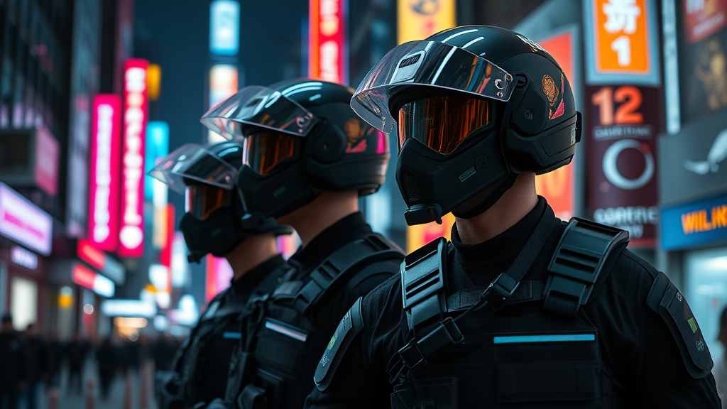 Officers patrolling the bustling streets in sleek, advanced riot gear, their helmets featuring cutting-edge technology, under the vibrant glow of neon city lights; the scene is alive with dramatic reflections and detailed textures, showcasing the intricate design of the urban landscape. The cinematic environment, rendered in stunning 8k resolution, highlights the photorealistic details, enhanced by dynamic lighting and depth of field, capturing the essence of a cyberpunk world, immersing the viewer in its moody and futuristic atmosphere.