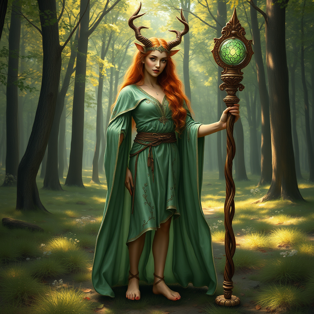 Oil painting, a standing female faun with auburn hair cascading down her back, cloven hooves instead of human feet, her legs adorned in soft deer fur, embodying the essence of a Satyr and fantasy cleric character. She dons a flowing, light emerald cloak, embroidered with intricate vine patterns, and holds a beautifully carved wooden staff topped with a glowing emerald orb. The scene captures a peaceful forest clearing bathed in dappled sunlight, enhancing the mythological and high fantasy atmosphere. 16k resolution, UHD, HDR, evoking a sense of wonder and magic.