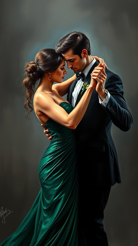 A captivating oil painting depicts a man and woman passionately engaged in a tango, both adorned in elegant formal attire. The woman flaunts a captivating emerald green dress, which contrasts beautifully with the deep gray background, enveloping the scene in mystery and sophistication. The man is gracefully poised in a classic black suit, his expression intent and focused. The dim backdrop adds depth, enhancing the painting’s allure and capturing a moment of electrifying connection and timeless elegance.