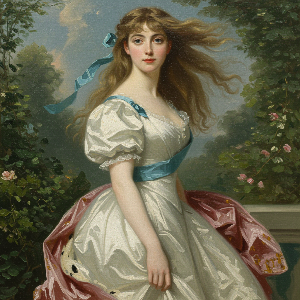 View this AI-generated image featuring a full body oil painting portrait of queen aprilia her long hair caught in a gentle breeze adorned with a blue ribbon delicately draped over her shoulder she wears an elegant white gown with puffy sleeves and a flowing sash reminiscent of the grand style of jea
