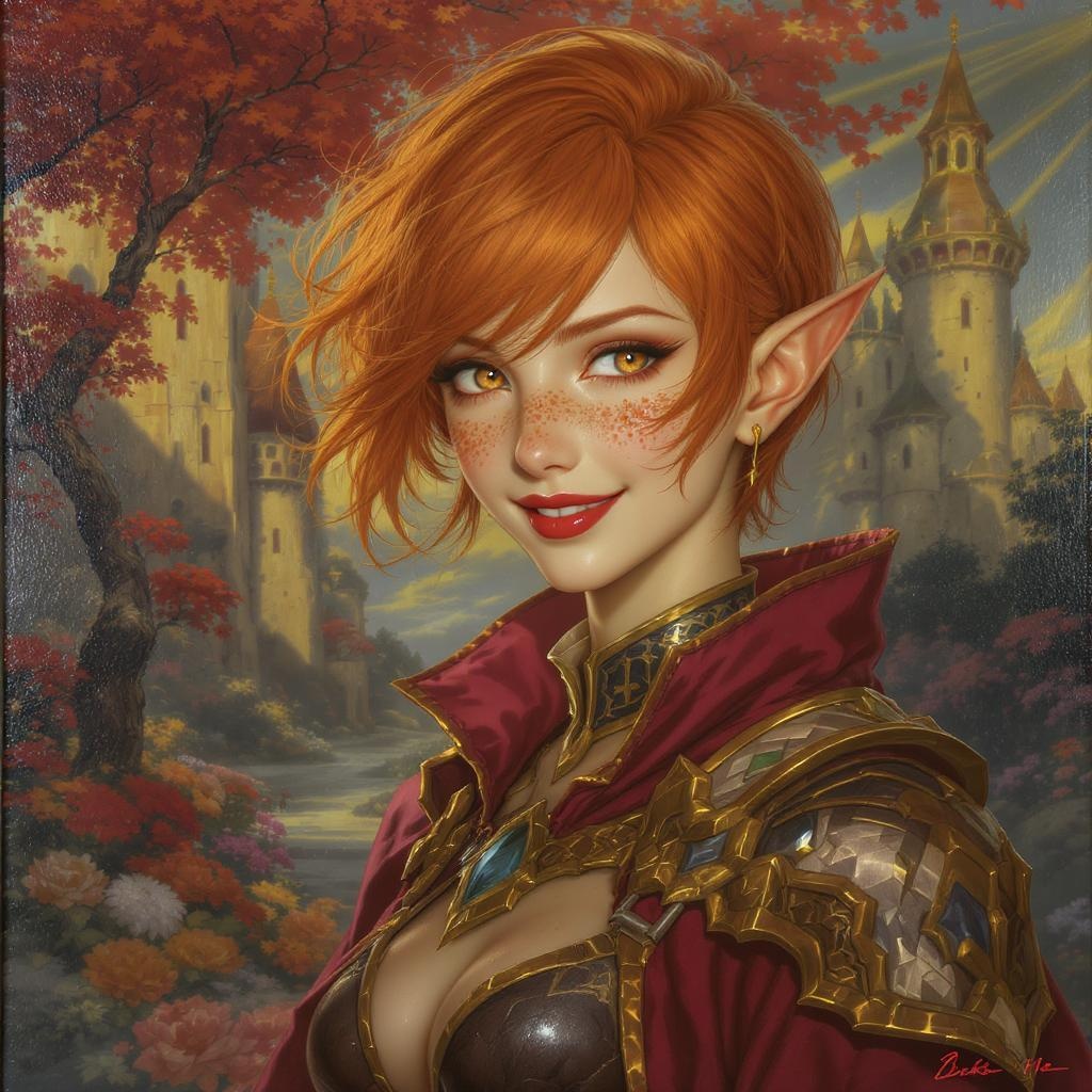 Oil painting, D&D fantasy, a stunning character with slender features, adorned with freckles and short, wavy fiery red hair. Smiling with pointed ears, the figure gazes directly at the viewer, embodying the essence of a cleric in an intricate adventurer outfit. The scene captures the character's 8k eyes, luminous with the golden ratio in a face rich with detailed expressions. Featuring big, dreamy anime eyes and meticulous details, there is a play of light accentuating the hair, with complementary colors enriching the composition. Set against a glamorous medieval city backdrop, the cover exudes top model allure amidst a colorful, hyper-detailed scenic landscape. With cinematic and volumetric lighting, the artwork is a masterpiece of ultra-fine detail and deep colors, with dramatic and ambient lighting casting god rays across a vibrant garden adorned with flowers. The atmosphere is imbued with a sense of UnrealisticDream and intrigue, brought to life through the laughter of an UnrealisticDream, with fast negative tones seamlessly blended to create an emotionally resonant BadDream.