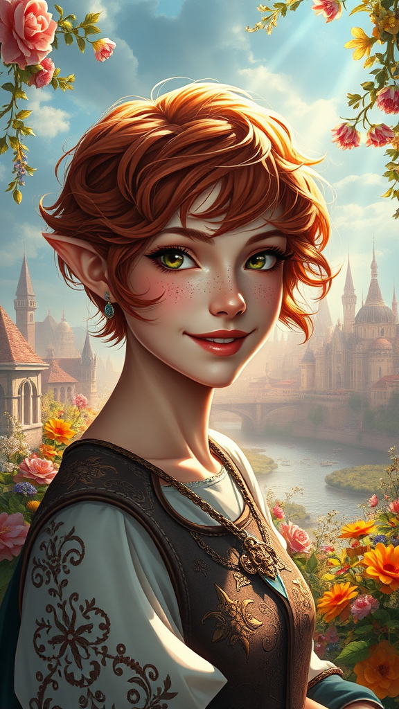 Oil painting, D&D fantasy theme, featuring a slender, beautiful young woman with short, wavy fiery red hair adorned with charming freckles. She has pointed ears and is smiling warmly as she gazes directly at the viewer. The character is a cleric, wearing an intricate and elegant adventurer outfit. Her eyes are 8k resolution, large and dreamy with an anime style, emphasizing the golden ratio in her detailed face. The scene features dramatic, cinematic, and ambient lighting, with intricate detail on the character and landscape. The background showcases a colorful, glamorous, hyper-detailed medieval city within a vibrant garden full of various flowers. The setting is a breathtaking and scenic view, filled with deep colors, complementing each other beautifully. The cityscape gleams under the effects of volumetric light and god rays, while ambient and dramatic lighting create a cinematic atmosphere reminiscent of ultra-realistic artwork and concept art. The overall scene is hyper-focused, with intricate and ultra-fine details akin to a cover of a top model in a fantastical setting.
