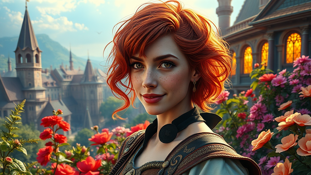 Oil painting, D&D fantasy, with freckles, slender and beautiful, short fiery red wavy hair, smiling with pointed ears, looking at the viewer. She is a cleric wearing an elaborate adventurer outfit, with mesmerizing 8k eyes that reflect the golden ratio, detailed face, big dreamy anime eyes, capturing intricate details with light accentuating her hair in complementary colors. Set against a vibrant, colorful, and glamorous hyper-detailed medieval city backdrop, the scene includes a breathtaking and scenic landscape full of intricate elements. The cinematic lighting and octane render effects introduce volumetric lighting for an enriched art piece, utilizing ultra-fine details and deep colors. The artwork offers dramatic and ambient lighting with god rays shining through a garden filled with vibrant flowers, encapsulating the essence of a top model in a cover image. The mood is a blend of FastNegativeV2 forestalling UnrealisticDream and BadDream, creating a hyper-focused aesthetic.