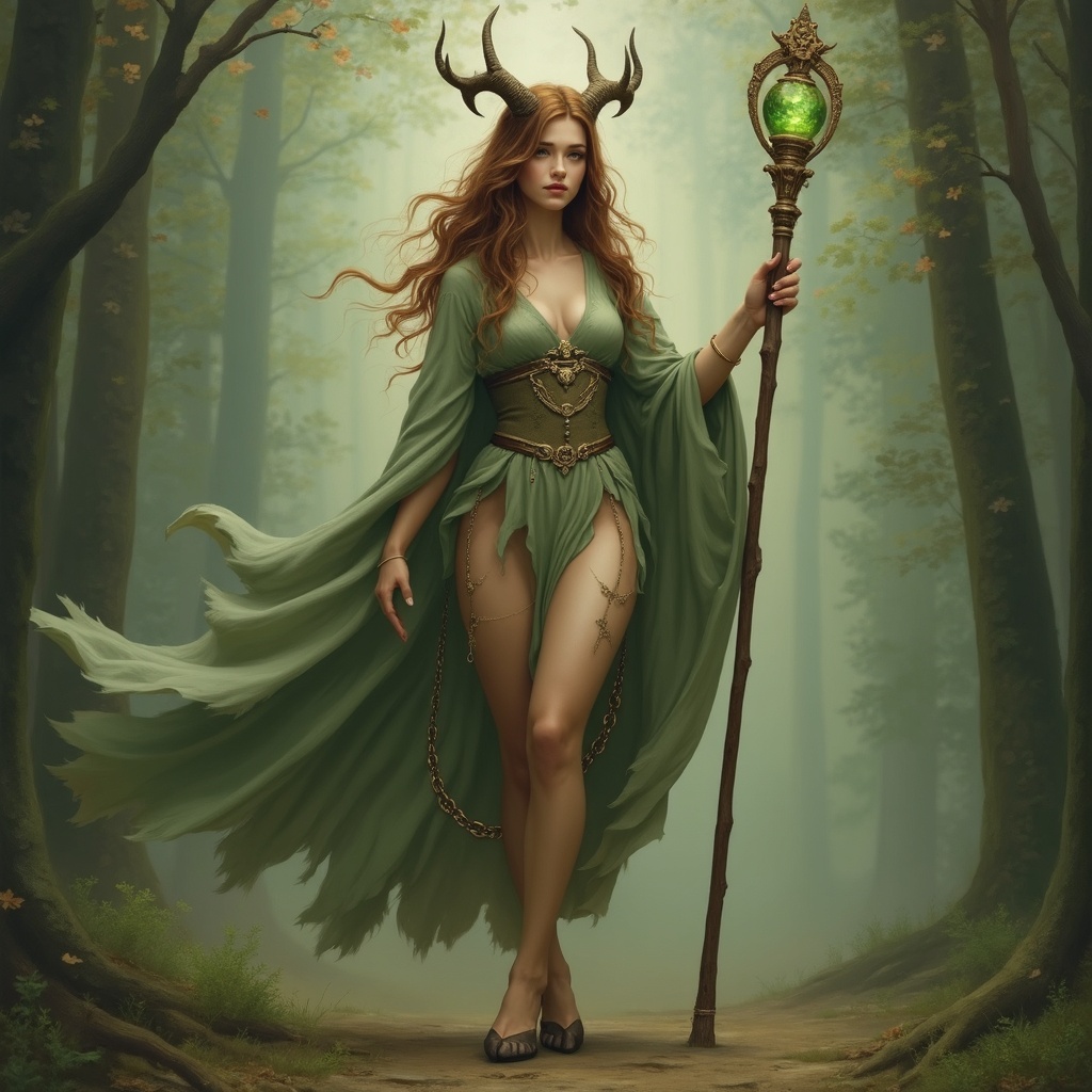 Oil painting of a standing female faun with wavy brown hair, possessing cloven hooves instead of human feet. Her legs are covered in soft deer fur, embodying the essence of a Satyr. She is imagined as a fantasy cleric character, adorned in a flowing light green cloak. In her hand, she gracefully holds a wooden staff crowned with a small, shimmering green orb at its top. The painting captures a panned out view, enveloping the scene in a mythological and high fantasy aura. The image is rendered in 16k resolution, with UHD and HDR quality, evoking a sense of depth and realism. The atmosphere carries subtle hints of FastNegativeV2, interwoven with elements of UnrealisticDream and BadDream, to create a surreal and enchanting narrative.