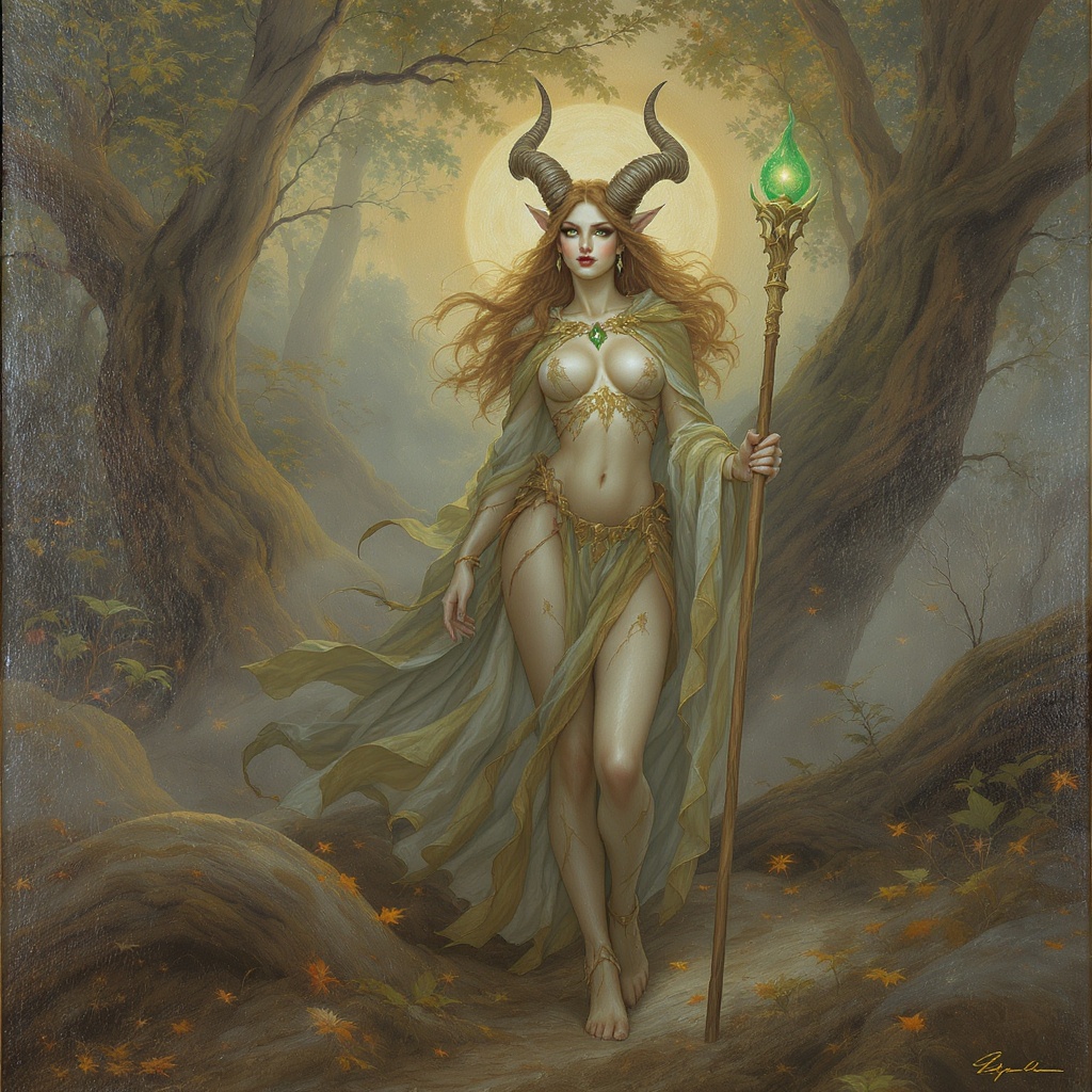 Oil painting of a standing female faun with flowing brown hair and cloven hooves in place of feet, her legs adorned with elegant deer fur, embodying the essence of a Satyr. She is portrayed as a fantasy cleric character, draped in a gentle, flowing light green cloak. In her hand, she gracefully holds a wooden staff, crowned with a small, shimmering green orb at its top. The scene offers a wide, panned-out view, capturing the essence of mythology and high fantasy. The painting boasts a 16k resolution, with UHD and HDR levels of detail, inviting viewers into a world that blends enchanting realism with an ethereal dreamlike quality.