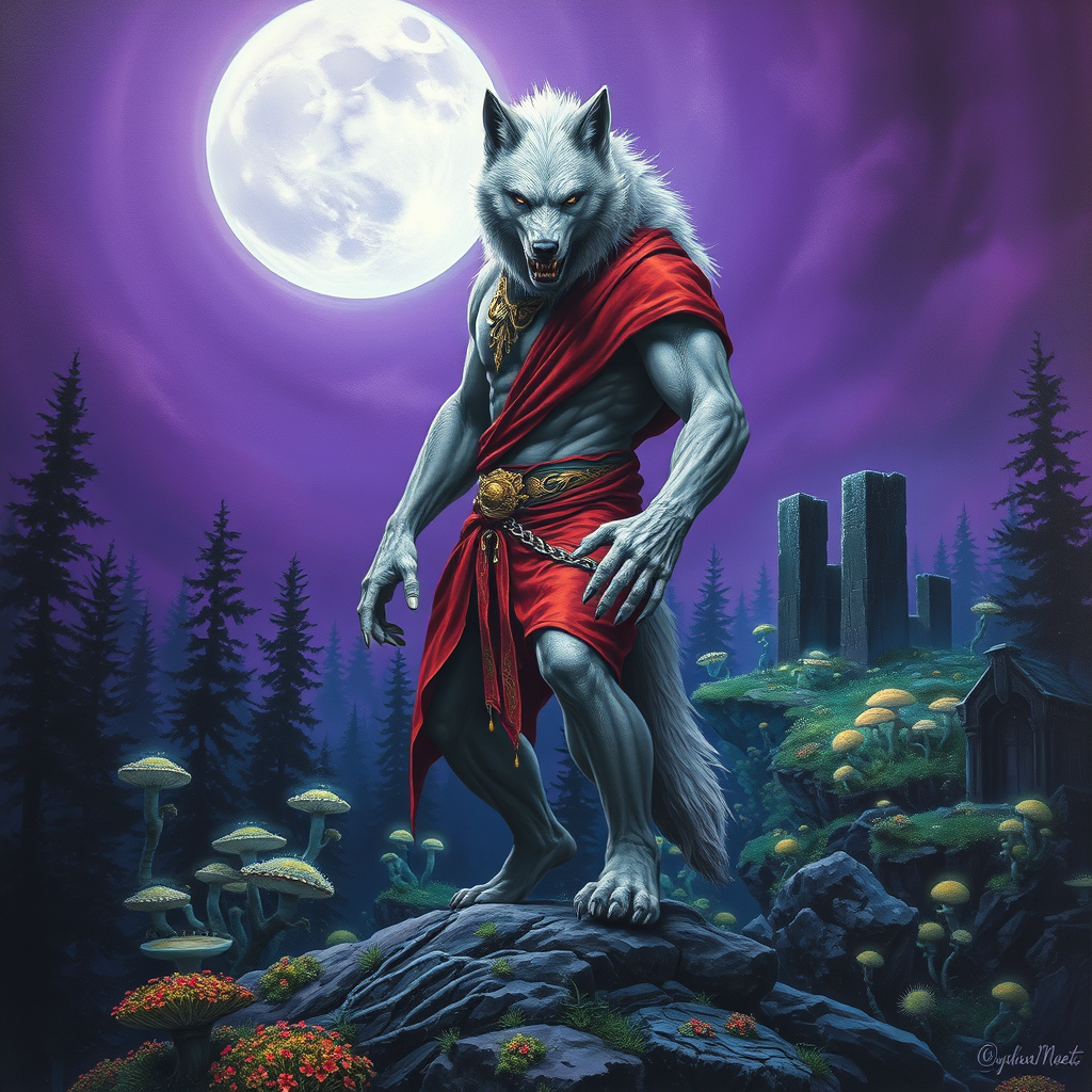 Oil painting, highly detailed, the landscape of a purple full moon's night, panned out view of the character, visible full body, Hyperrealist grey-skinned menacing muscular white werewolf in a battle stance, wearing crimson clothes with gold leaf details, standing at the top of a dense hill overlooking a dark mystical forest of fluorescent fungi and neon-lit moss, standing in front of an ancient ruined structure.