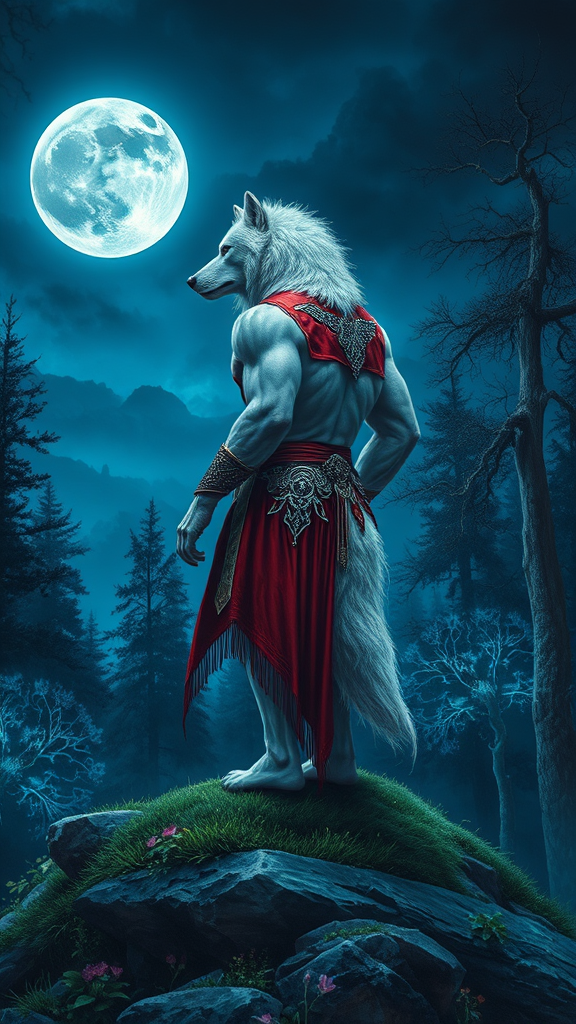 Oil painting, intricately detailed landscape of a blue full moon's night, zoomed-out view of the character, full-body visible, a hyperrealist grey-skinned, imposing, muscular white werewolf poised in a battle stance, adorned in red attire with intricate silver filigree accents, standing atop a lush hill gazing toward the horizon in a dark, enchanting forest illuminated by bioluminescent trees and glowing flora, Ultra High Definition, High Dynamic Range, 8K resolution.