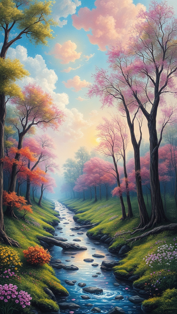 Oil painting, magical forest, Alluring visions of bubblegum skies, Mystical woodland with glittering streams, Surreally interdimensional realm with levitating tree spirits, Whimsically enchanting atmosphere with polka-dotted squirrels, Technical specs of a dynamic paint palette::3 chromatic hues::3 sacred geometry::3 panoramic lens::3.
