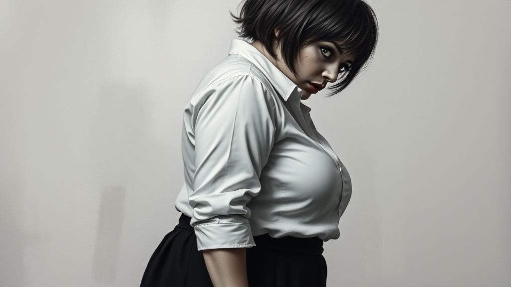 Oil painting masterpiece depicting a mature, plump female in best quality, featuring a solo composition from the side. She wears a white shirt paired with a black skirt, her closed mouth suggesting contemplation. With short dark brown hair and striking green eyes, the figure exudes an enigmatic elegance. The monochrome palette adds depth to the scene, introducing nuanced shades of grey, while subtle zombie-like elements lend an unexpected twist to the portrayal.