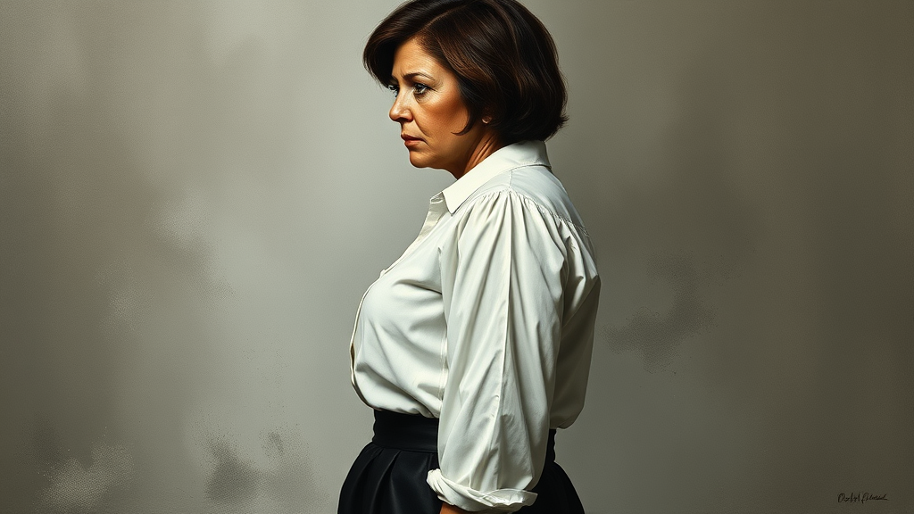 Oil painting, masterpiece, premium quality, single subject, mature woman, profile view, wearing a white blouse and a black skirt, expressionless, short dark brown hair, striking green eyes, full-figured, adult, monochrome palette, thematic twist incorporating a touch of the surreal and zombie motif.