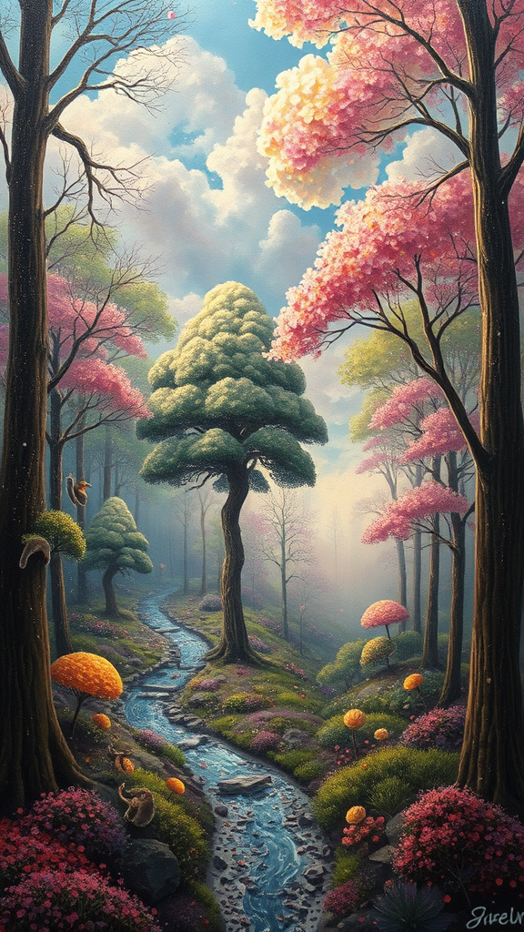 Oil painting, mystical forest, captivating scenes of candyfloss clouds, magical woodland with shimmering confetti streams, surreal interdimensional landscape featuring levitating treemen, whimsically charming atmosphere with spotted squirrels, technical details of a shifting hue paint palette::3 chromatic::3 sacred geometry::3 ultra wide lens::3.