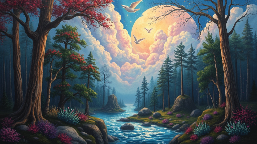 Oil painting, mystical woodland, captivating depictions of candyfloss clouds, enchanting forest with glittering rivers, whimsically interdimensional atmosphere with soaring arboreal figures, delightfully magical aura with plaid-patterned squirrels, technical specs of a dynamic color-shifting paint palette, 3 chromatic harmonies, 3 sacred geometry motifs, ultra wide angle perspective, imaginative reverie with vivid hues.