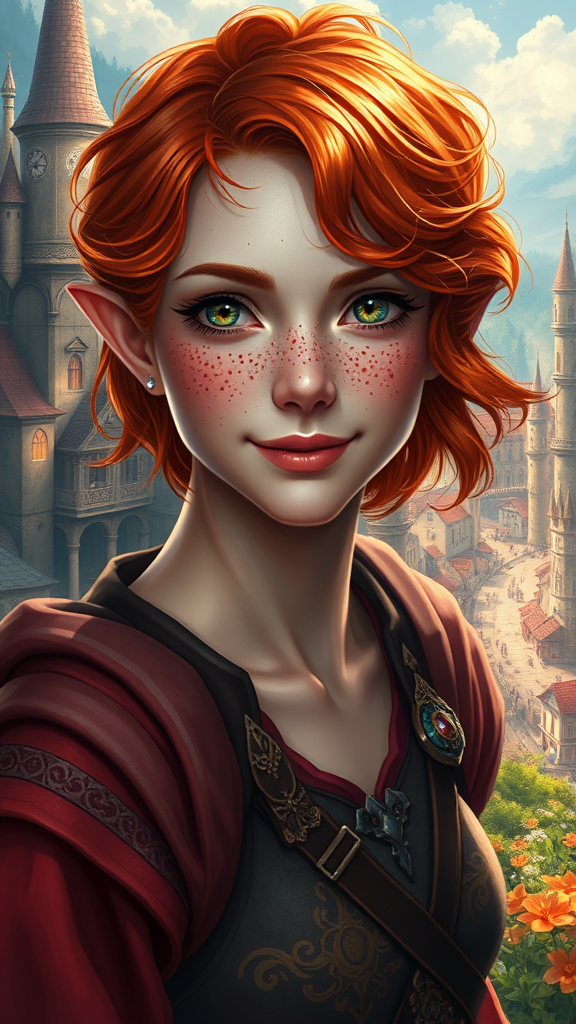 Oil painting of a D&D fantasy character with freckles, slender and beautiful, featuring short fiery red wavy hair. The character is smiling with pointed ears, looking at the viewer, embodying a cleric wearing an intricate adventurer outfit. The scene captures the essence of 8k eyes and the golden ratio, presenting a detailed face with big, dreamy anime eyes and intricate detailing. The hair is illuminated by light with complementary colors. Set against a cover-worthy backdrop, the character resembles a top model, surrounded by a colorful, glamorous, hyper-detailed medieval city. The background provides an intricate, breathtaking, vivid scenic view with cinematic lighting and octane render, enveloped in volumetric lighting. The artwork serves as concept art filled with ultra-fine details, hyper-focused with deep, dramatic, ambient lighting. God rays filter through, highlighting a garden full of flowers. This scene combines elements of FastNegativeV2, UnrealisticDream, and BadDream with small creative modifications, maintaining the core essence.