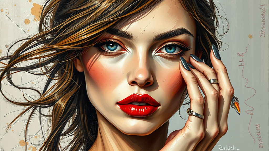 Oil painting of a fashion model, featuring bold strokes and rich textures, inspired by Kaethe Butcher, Greg Tocchini, Hajime Sorayama, Jeremy Mann, and Carne Griffiths. The digital illustration captures the model with flawless eyes and flowing hair, radiating elegance, calmness, confidence, and a touch of seduction in an expressionistic style. The piece is intricate and unique, with an unconventional approach to composition and anatomy, embracing imperfections such as distorted features and exaggerated proportions. It explores themes of mutation and surrealism with elements like fused fingers, extra limbs, and abstract forms, creating a provocative and intriguing visual narrative free from text, signatures, or watermarks.