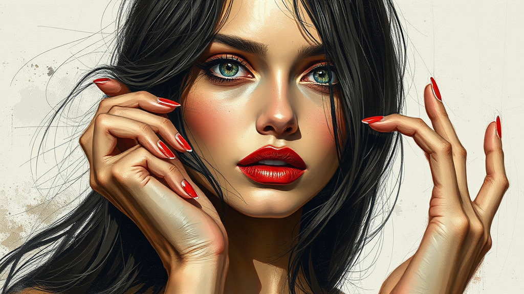 Oil painting of a fashion model, featuring bold, textured strokes, inspired by Kaethe Butcher, Greg Tocchini, Hajime Sorayama, Jeremy Mann, Carne Griffiths, in a digital illustration style. The model has perfect eyes and long hair, exuding elegance, calmness, confidence, and seduction. The piece leans towards expressionism with intricate details, yet intentionally incorporates abstract elements like distorted anatomy such as extra limbs, fused fingers, and disproportionate features, creating an unconventional beauty. The artwork is a play on imperfections, experimenting with unusual compositions and perspectives, while subtly hinting at a critique of traditional beauty standards. It embraces digital imperfections like jpeg artifacts and deliberately plays with poor proportions to challenge the viewer's perception of aesthetic norms.