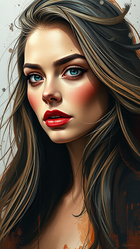 Oil painting of a fashion model, featuring heavy strokes and textured surfaces, inspired by the styles of Kaethe Butcher, Greg Tocchini, Hajime Sorayama, Jeremy Mann, and Carne Griffiths. The digital illustration highlights perfect eyes and long, flowing hair, portraying elegance, calmness, and confident seduction. Embracing expressionism, the artwork is intricate and detailed, capturing beauty within an abstract form. However, it incorporates elements that are intentionally imperfect, such as bad angles, unusual compositions, and low-detail areas. The model is depicted with intentionally deformed features like an iris and pupils, and digital artifacts enhance the complexity of the piece. Occasionally, anatomy is distorted with creative interpretations like extra or fused fingers, while avoiding text and logos. The overall piece balances beauty and chaos, challenging traditional aesthetics with its bold design choices.