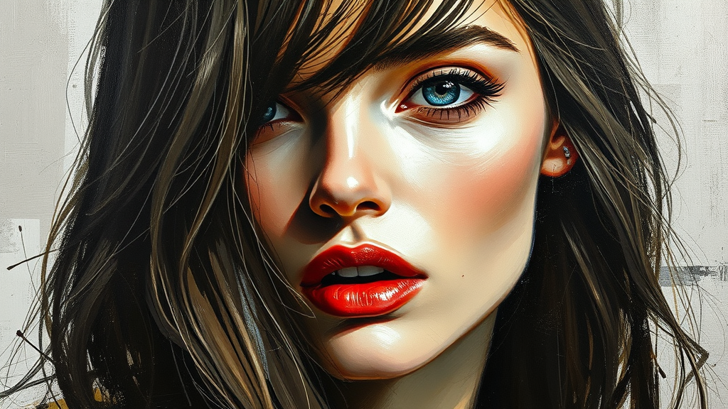 Oil painting of a fashion model, with expressive and textured heavy strokes, inspired by the styles of Kaethe Butcher, Greg Tocchini, Hajime Sorayama, Jeremy Mann, and Carne Griffiths, showcasing perfect eyes and long hair. The model exudes elegance, calmness, confidence, and seduction, with an expressionist touch. The composition is intricate and detailed, embracing artistic aesthetics without focusing on realistic imperfections or distortions. Minimal emphasis on anatomical accuracy, creating a unique and creative visual experience that highlights the art's interpretative nature without unnecessary clutter or distractions.
