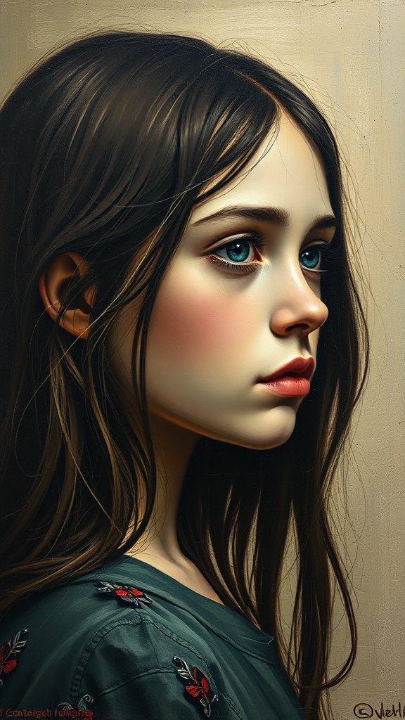 Oil painting of a girl in right face composition, featuring empty eyes with a distant gaze. The artwork has a grainy touch, capturing a minimalist avant-garde essence with rich detailing. Inspired by the style of Diego Velazquez, it incorporates an intriguing array of knives, adding a rough edge to the composition. The piece maintains a personalized touch, highlighting a balance between raw emotion and refined artistry.