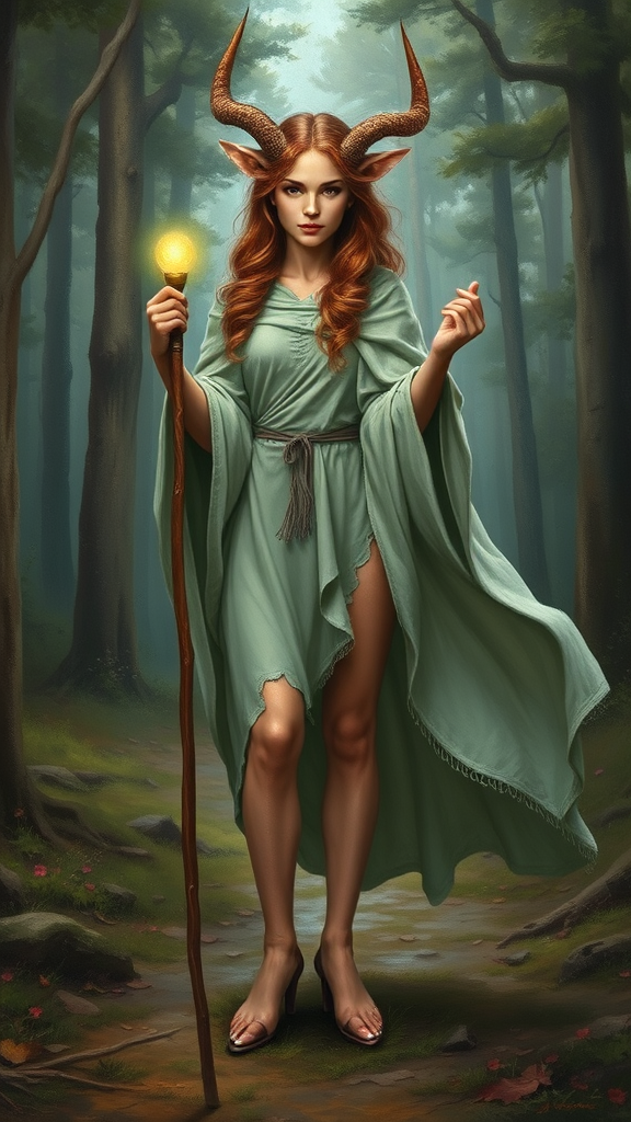 Oil painting of a standing female faun with wavy chestnut brown hair, cloven hooves for feet, and soft deer fur on her legs, embodying a satyr look. She is envisioned as a fantasy cleric character, adorned in an ethereal light green cloak that billows gently in an unseen breeze. In her hand, she holds a wooden staff topped with a luminous, small green orb that glows softly, hinting at mystical powers. The scene is set in a lush forest clearing, with the surroundings capturing the essence of mythology and high fantasy. The painting features a detailed, wide-angle view rendered in 16k resolution, offering UHD and HDR clarity. The artwork embraces a dream-like quality while maintaining a balance between realism and fantasy. The atmosphere is serene yet otherworldly, evoking a sense of wonder and enchantment.