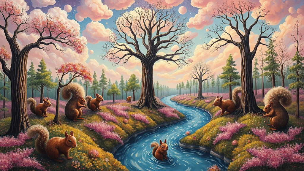 Oil painting of a whimsical forest, featuring ethereal bubblegum clouds and a mystical woodland with rivers resembling streams of colorful confetti. The scene is set in a quirky interdimensional realm where tree men float gracefully, surrounded by charming polka-dotted squirrels that add a touch of humor and enchantment. The artwork uses a color-changing paint palette, emphasizing a triad of chromatic hues, the sacred geometry of the flower of life, and the expansive perspective of an ultra wide angle lens.