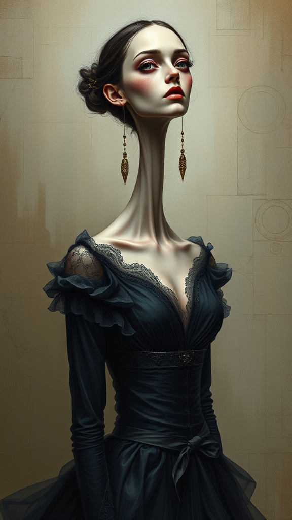 Oil painting of a woman in a dress styled in modern gothic attire, digital painting with intricate details, featuring an elongated neck and slim face, exhibiting a juxtaposition of elegance and distortion, with elements of surrealism. The artwork is rendered in high resolution, capturing the essence of a masterpiece with unreal qualities, blending beauty and unsettling features, such as subtle deformations and abstract tiling, creating a unique, haunting allure. The piece conveys a blend of beauty and grotesque, provoking a sense of intrigue and fascination.