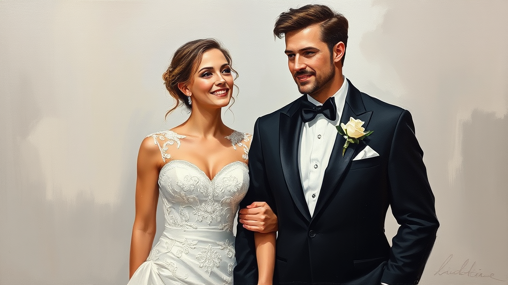 Oil painting on canvas depicting a couple standing together at their wedding, both in elegant formal attire. She wears an ivory wedding gown with intricate lace detailing, while he dons a classic black tuxedo. The background is a subtle, misty gray, enhancing the painting's sophisticated ambiance. Dynamic, sweeping brushstrokes and a palette knife technique bring texture and depth to the scene, adding a sense of movement and romance. The couple's expressions convey joy and anticipation, capturing the essence of their special day.