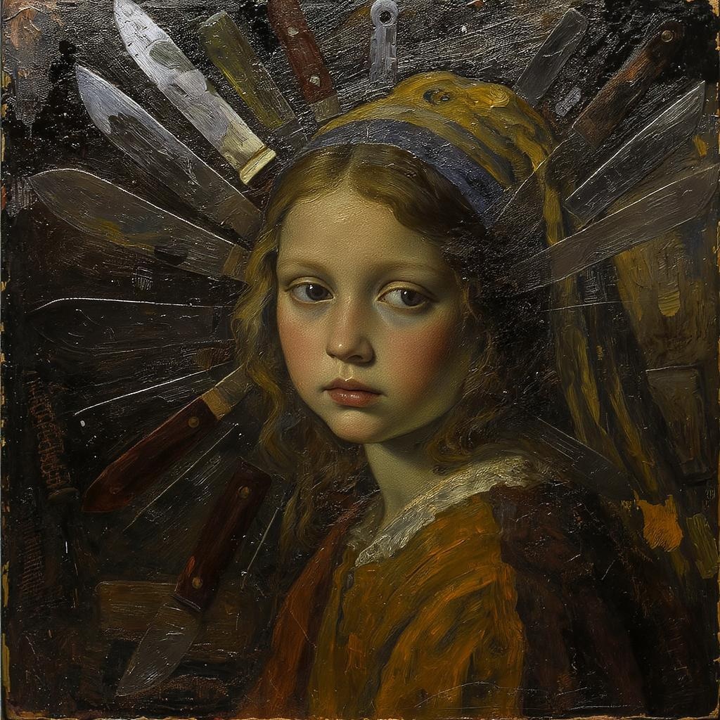 Oil painting portrait of a girl with vacant eyes and a penetrating gaze, textured with a grainy finish, in a style inspired by Diego Velázquez. Surround her with an array of knives, each catching light in a unique way. The composition feels raw and intense, with rough, expressive brushstrokes, capturing a haunting beauty amidst chaos.