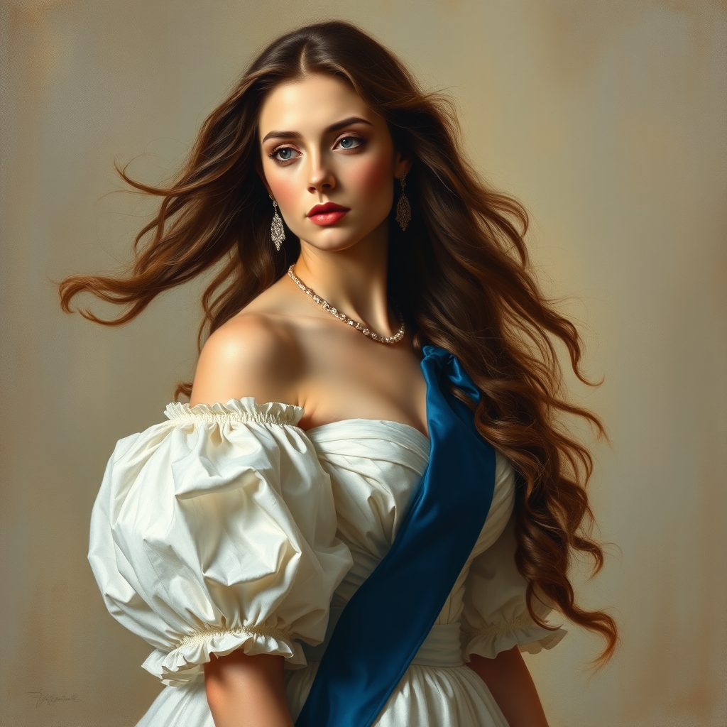 Oil painting portrait of Queen Aprilia, portrayed in a full-body composition, her long hair billowing gently in the breeze. She is adorned with an elegant white gown featuring puffy sleeves and a flowing sash, accentuated by a cobalt blue ribbon cascading over her shoulder. The artwork captures the timeless elegance and detailed realism synonymous with Jean-Léon Gérôme's and John Singer Sargent's styles, evoking a sense of regal poise and grace. The painting exudes a raw, stylistic richness, with vibrant textures and a dynamic interplay of light and shadow, preserving the core concept while introducing subtle artistic nuances.