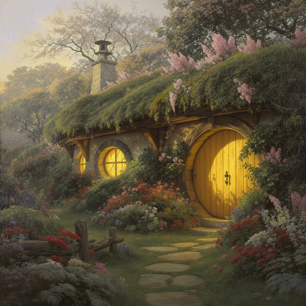 A serene and enchanting oil painting of a hobbit's shire, capturing the essence of tranquility and beauty. Inspired by renowned artists like Ed Blinkey, Atey Ghailan, and Studio Ghibli, this piece combines the majestic artistry of Jeremy Mann, Greg Manchess, and Antonio Moro. The painting, trending on ArtStation and CGSociety, showcases intricate, high-detail work with sharp focus and photorealistic qualities. It blends the whimsical style of SylvaMagic with dramatic and serene landscapes. The artwork avoids the pitfalls of disproportionate or surreal elements, focusing instead on a coherent and captivating representation that embraces vibrant colors and harmonious composition, ensuring a captivating and masterful depiction.