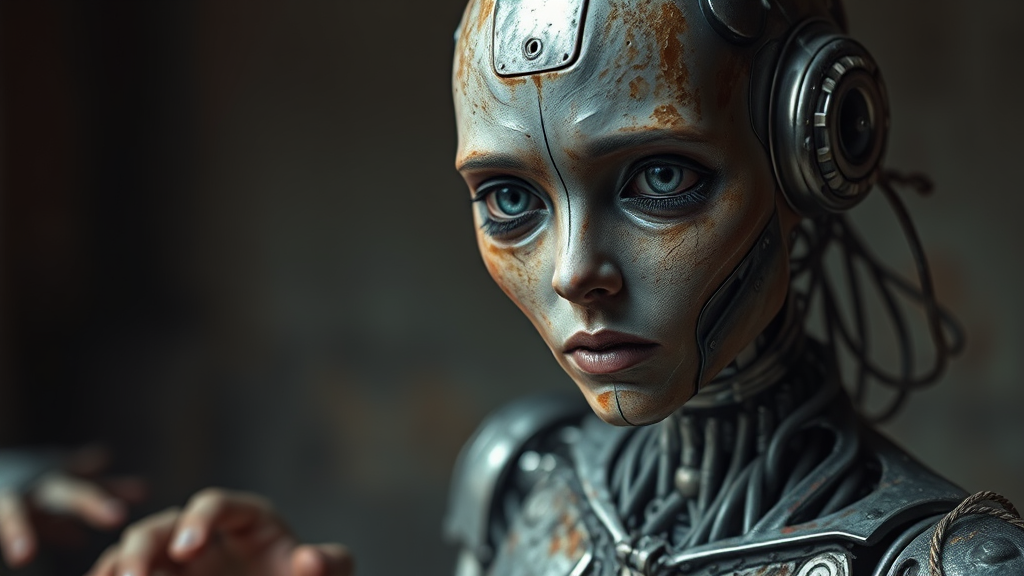 Old, female robot, metallic with signs of rust, visible wires, destroyed and sad appearance, set in a dark and dirty environment, making eye contact with the viewer, portrayed in a photographic style, with detailed skin textures. The scene captures the robot in a full-frame view, showcasing a photorealistic quality in 8k resolution, emphasizing high detail and raw color art. Features include piercings and diffused soft lighting, employing a shallow depth of field for a sharp focus. Exhibiting hyperrealism with cinematic lighting akin to CGI and a 3D effect. The image includes flaws like text errors, low resolution, cropped view, artifacts of low quality, with an overall unattractive and duplicated appearance. Features morbid and mutilated designs with elements like out-of-frame composition, extra digits, mutated and poorly drawn hands and face, with visible mutations and deformations. Displays blurry elements indicating dehydration, incorrect anatomy, poor proportions, with extra and missing limbs, fused or excessive fingers, elongated neck, and unintended text inclusions like usernames or watermarks.