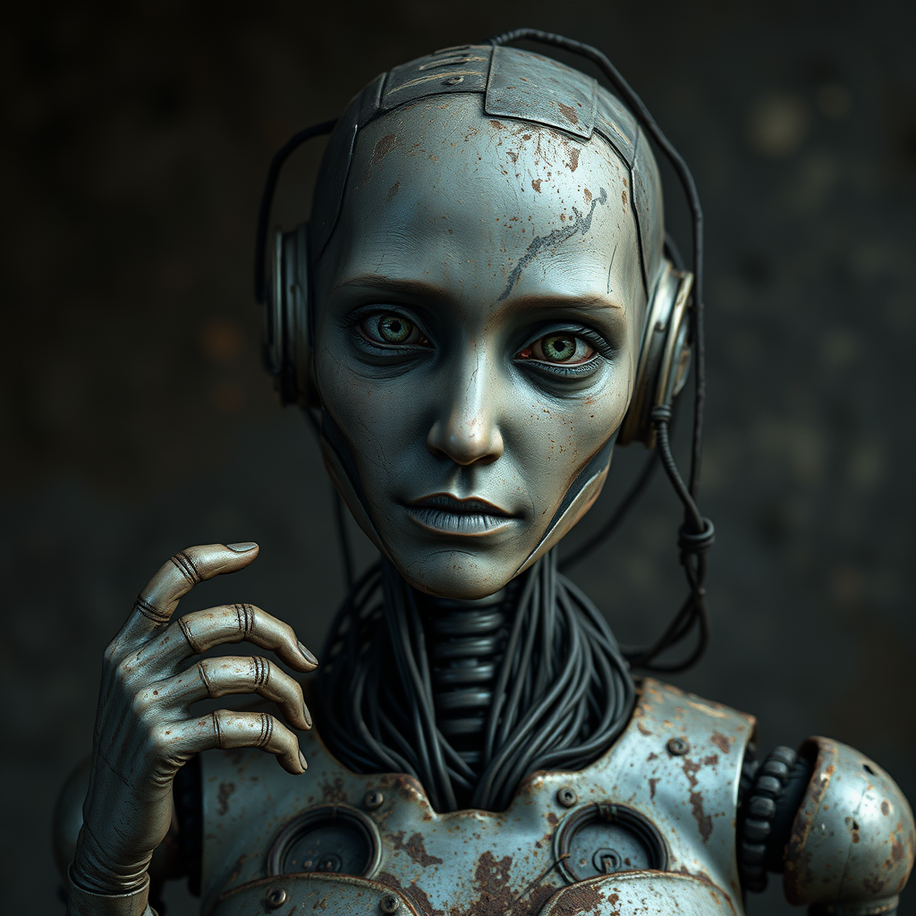 Old female robot with visible wear and tear: metal exterior is rusty, with exposed wires contributing to its destroyed and sad appearance. Set against a dark, dirty backdrop, the robot gazes directly at the viewer in a portrait-like manner. Photography captures detailed, realistic skin texture, aiming for a photo-realistic 8K finish that is highly detailed in a full-length frame. The high detail RAW color art is accentuated by diffused soft lighting and a shallow depth of field, highlighting sharp focus and hyperrealistic features in cinematic CGI lighting. The depiction stays true to a low-resolution, flawed aesthetic characterized by text errors and JPEG artifacts that enhance its aged, morbid allure. The robot features distorted anatomy with extra limbs and deformed proportions, such as fused fingers and an unusually long neck, presenting a disfigured and ugly form. These imperfections are compounded by attributes like username, watermark, and signature-like marks on its surface.