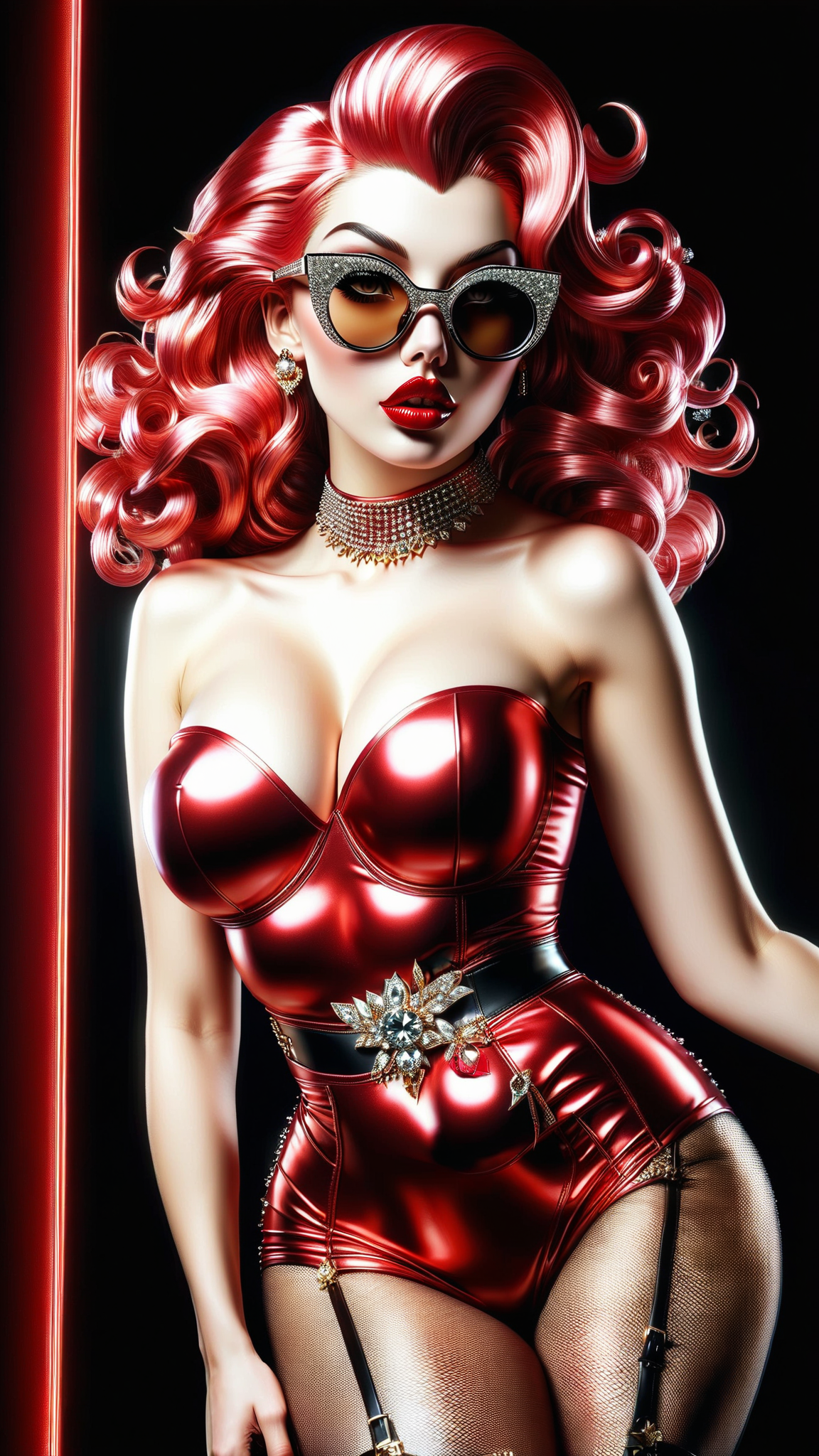 Old Hollywood meets modern pop culture, and she's got that Boop-Boop-be-doop! She's also a supervillain capable of blowing you down with her kisses! The power blasts forward from her in red lip-shaped energy! feminine woman, young Caucasian female. Actress, sort of like Betty Boop. Red is her favorite color! Fun, vivacious, lively, glamorous. Tall, leggy, strong, fit, busty, thin but curvy. Beautiful face, sparkling Hazel eyes with long eyelashes. Medium length hair to her shoulders, with fluffy bouncy burgundy colored curls, glamorously styled. Usually dark sunglasses perched on top of her head. Shiny, glossy ruby-red lips, usually blowing kisses. Shiny, glimmering red mini-dress with cut-out shoulders, form fitting material. Black leather designer belt around her waist. The dress is slit on one side. Red fishnet stockings on her legs, with knee-high red stiletto heeled boots on her feet. Her power is her lips, blowing kisses from the other side of the room. Full body pose.