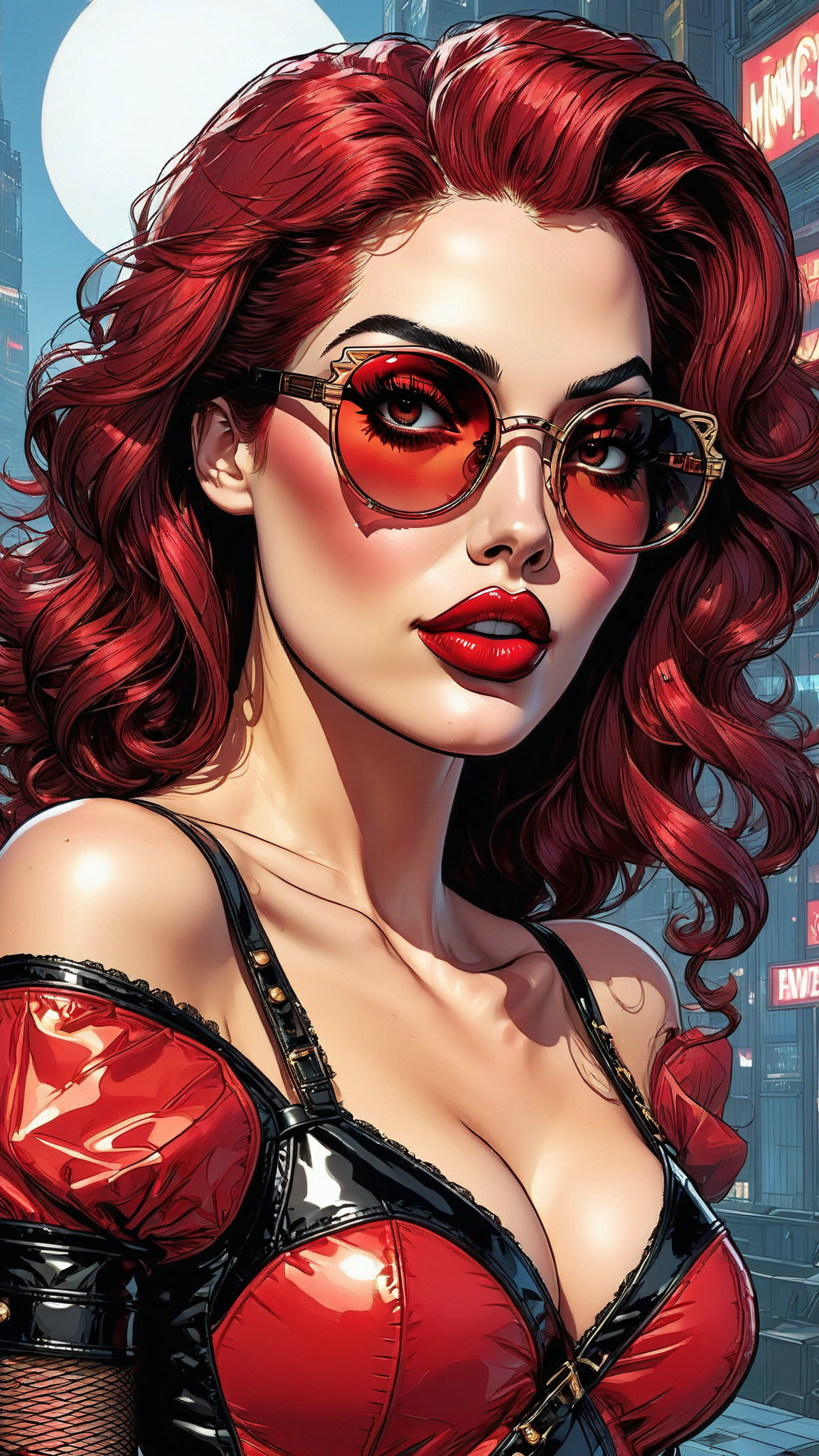 Old Hollywood meets modern pop culture, and she's got that Boop-Boop-be-doop! She's also a supervillain capable of blowing you down with her kisses! The power blasts forward from her in red lip-shaped energy! feminine woman, young Caucasian female. Actress, sort of like Betty Boop. Red is her favorite color! Fun, vivacious, lively, glamorous. Tall, leggy, strong, fit, busty, thin but curvy. Beautiful face, sparkling Hazel eyes with long eyelashes. Medium length hair to her shoulders, with fluffy bouncy burgundy colored curls, glamorously styled. Usually dark sunglasses perched on top of her head. Shiny, glossy ruby-red lips, usually blowing kisses. Shiny, glimmering red mini-dress with cut-out shoulders, form fitting material. Black leather designer belt around her waist. The dress is slit on one side. Red fishnet stockings on her legs, with knee-high red stiletto heeled boots on her feet. Her power is her lips, blowing kisses from the other side of the room. Full body pose.